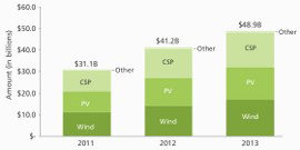 “美國(guó)可再生能源融資:2010-2013年概況及未來展望”預(yù)計(jì):到2013年,美國(guó)公用事業(yè)規(guī)模的太陽能光伏發(fā)電和聚光太陽能發(fā)電項(xiàng)目將達(dá)22吉瓦,項(xiàng)目融資需求達(dá)766億美元,但在太陽能光伏和聚光太陽能發(fā)電兩個(gè)項(xiàng)目中,實(shí)際上將只有15.7吉瓦能夠獲得總共540億美元的融資。