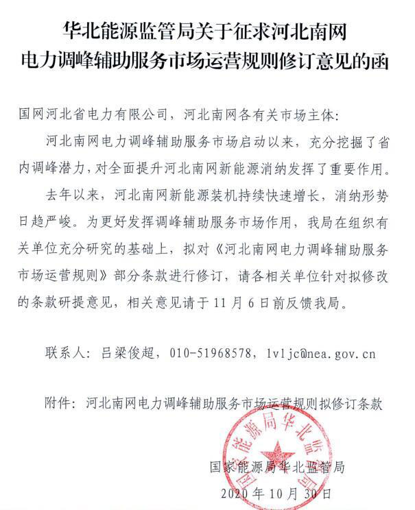 中國儲能網(wǎng)訊:11月2日,華北能源監(jiān)管局印發(fā)關(guān)于征求河北南網(wǎng)電力調(diào)峰輔助服務(wù)市場運營規(guī)則修訂意見的函,就擬修改條款征求意見。詳情如下: