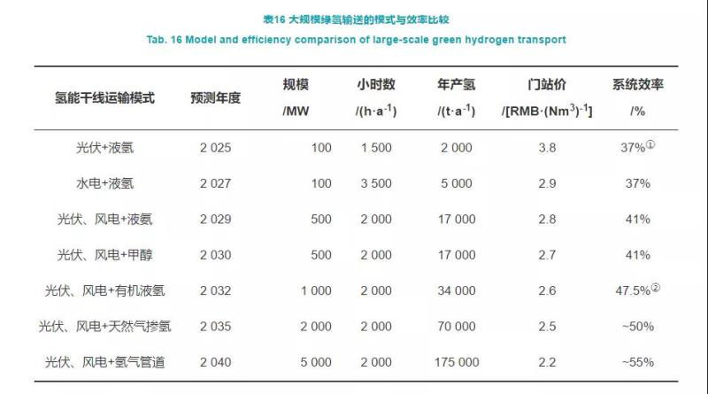 現(xiàn)有的氫氣儲運技術(shù),可以提供大規(guī)模氫氣輸送的方式有管道、液氫和化學(xué)儲氫,表16給出了不同規(guī)模下的氫儲運模式,對應(yīng)的經(jīng)濟性和系統(tǒng)效率: