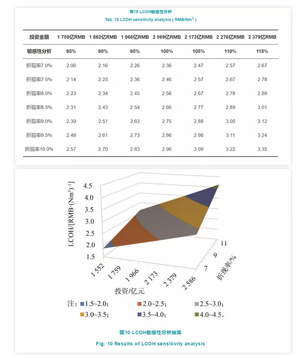 從敏感性分析(見表15和圖10)可以看出,投資對LCOE的影響顯著,隨著投資變化10%,氫能的LCOE的相應(yīng)有略低于10%變化。