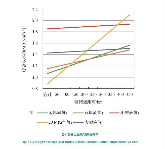液氫、固氫和有機氫,在現(xiàn)有條件下固定成本1.0~1.9 RMB/Nm3,超過TT車0.9 RMB/Nm3,主要成本在制備和接收兩端,液氫15 kWh/kg的液化能耗、固氫和有機氫10 kWh/kg的脫氫電耗,直接影響了氫的儲運成本。氫氣的運輸成本與運輸距離的關(guān)系如圖7所示。