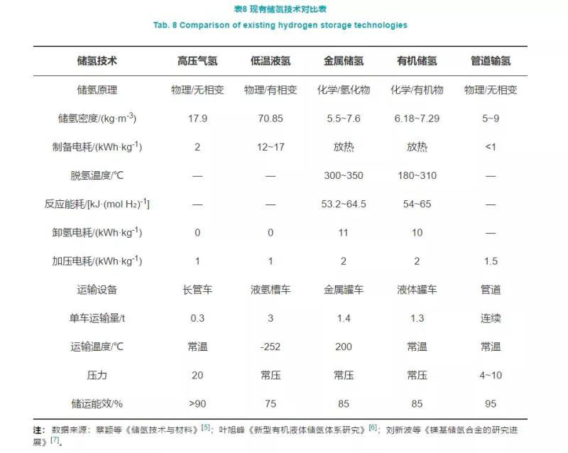 氫氣的儲運是比較復(fù)雜的,現(xiàn)有和在研究具備工業(yè)應(yīng)用條件的儲運技術(shù),包括高壓氫、液氫、金屬固氫、有機液氫、管道氫等技術(shù),綜合目前工業(yè)應(yīng)用的實際情況,氫儲運技術(shù)的關(guān)鍵指標比較如表8所示。