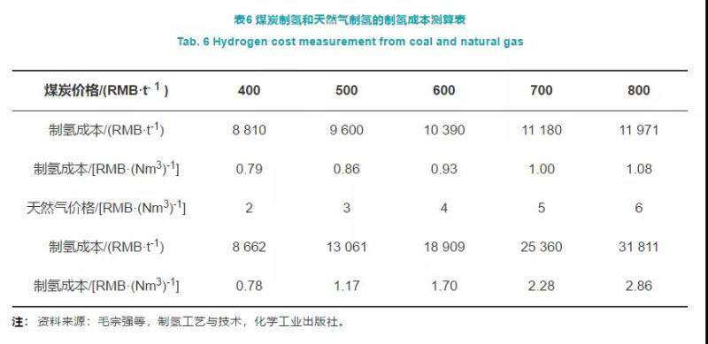 目前已經(jīng)實現(xiàn)大規(guī)模工業(yè)化制氫的煤化工制氫和天然氣制氫,根據(jù)中國石油經(jīng)濟研究院惠州煉油項目測算的制氫成本大制如表6所示。