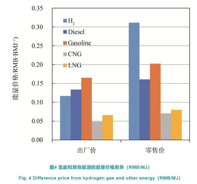 (1)氫能由于較高的利用效率和環(huán)境友好性,作為交通能源具有比較優(yōu)勢,和常規(guī)的汽柴油比較,在低于4.0 RMB/Nm3的終端價格下,氫能具備大規(guī)模使用的經(jīng)濟性。