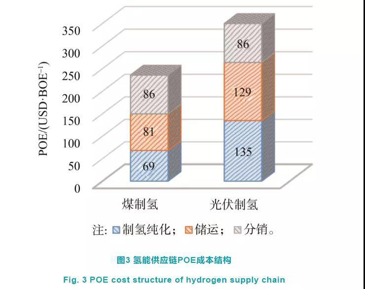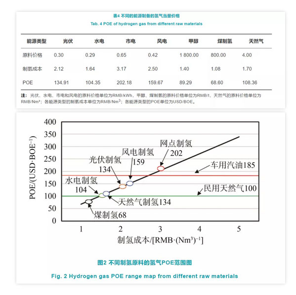 結(jié)合短距離的氫能儲運分析計算,終端100 km范圍內(nèi)的成本約為1.2 RMB/Nm3。氫能最終到達終端的成本約為3.2 RMB/Nm3,POE價格約為200 USD/BOE,與汽油價格接近并有進一步降低的空間。