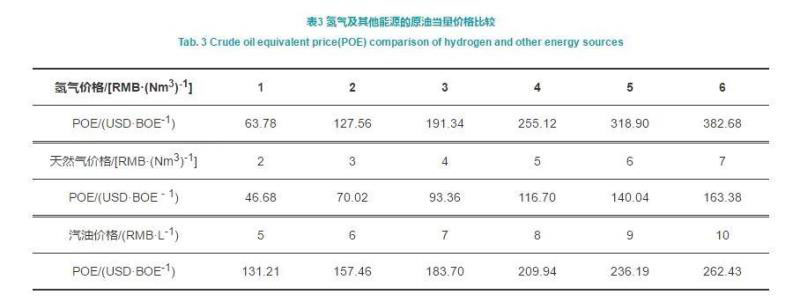 因此,我們能源當(dāng)量價格比較時,將氫能價格與二次能源價格進行縱向與橫向的對比,以分析其經(jīng)濟性條件。氫氣與成品油、天然氣等市場價格折合成原油當(dāng)量的價格比較如表3所示。