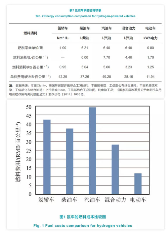 中國汽車工程學(xué)會發(fā)布的《世界氫能與燃料電池汽車產(chǎn)業(yè)發(fā)展報告(2018)》分析了乘用車和商用車的氫能耗。通過整理公開渠道公布的燃料消耗進行比較,氫能汽車和其他乘用車的燃料消耗如表2和圖1所示。