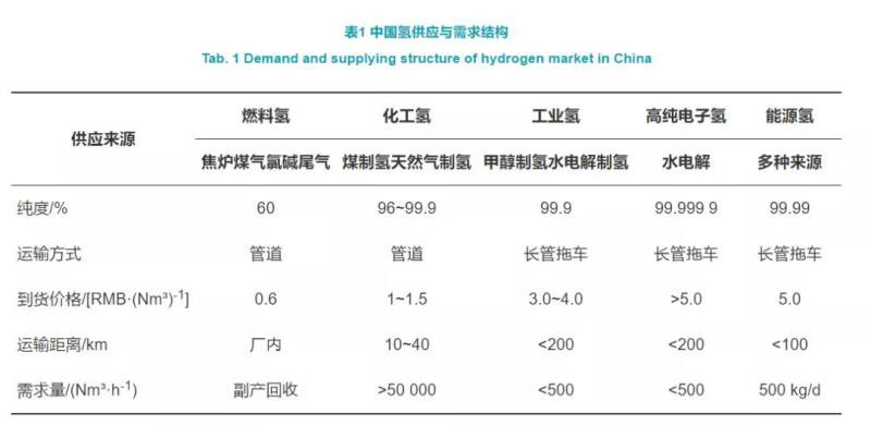 氫氣供應(yīng)鏈成本遠高于天然氣,因而,氫氣的供應(yīng)與使用受運輸距離限制,根據(jù)國內(nèi)的資料顯示(見表1),中國氫氣的市場大致分為燃料氫、化工氫、能源氫,對應(yīng)的氫氣市場價格分別為:
