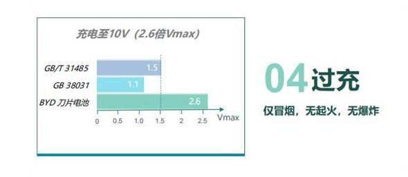 在過充測試中,比亞迪刀片電池以1倍率電流充電至終止電壓的2.6倍時終止充電,并且在1小時觀察期內(nèi)沒有出現(xiàn)起火、爆炸等現(xiàn)象。用更高的防過充標(biāo)準(zhǔn)降低由過充引發(fā)自燃的幾率,刀片電池讓新能源汽車的安全性能更上一層樓。