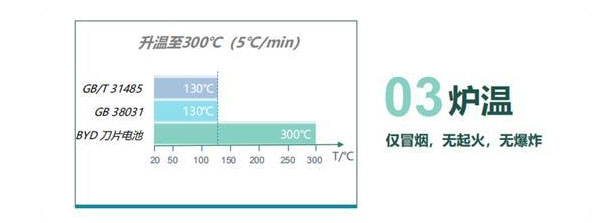 刀片電池使用磷酸鐵鋰材料,耐高溫性能更加優(yōu)異。爐溫測試中,刀片電池在超過國家標(biāo)準(zhǔn)要求溫度2倍多、達到300°高溫情況下保持30分鐘,期間沒有出現(xiàn)起火或者爆炸等現(xiàn)象。當(dāng)遇到停車場相鄰車輛起火等狀況,刀片電池超強的耐高溫性能,能夠讓新能源汽車在高溫環(huán)境下最大限度保證電池安全。