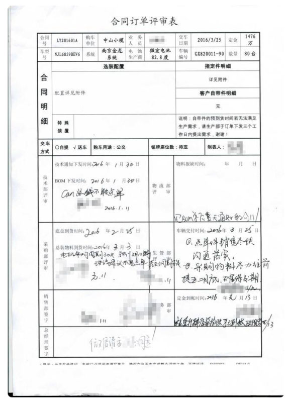 在記者獲得的一份《南京金龍配置要求響應(yīng)表》及南京金龍的一份合同訂單評(píng)審表(排產(chǎn)單)中顯示,合同號(hào)為LY201601A,購車單位為中山小欖,車型為NJL6859BEV6,采用南京金龍系統(tǒng),電池生產(chǎn)商為微宏電池,電量為82.8 kW·h,車輛編號(hào)為GX820011-90,數(shù)量為80臺(tái),交付日期為2016年3月25日,定金為1476萬元,定金到賬日期為2016年1月13日。