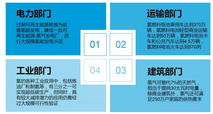 2019年2月,歐洲燃料電池和氫能聯(lián)合組織結(jié)合17家活躍于氫和燃料電池技術(shù)領(lǐng)域的企業(yè)的信息和數(shù)據(jù),制定并發(fā)布《歐洲氫能路線圖:歐洲能源轉(zhuǎn)型的可持續(xù)發(fā)展路徑》。報告提出歐洲發(fā)展氫能的路線圖,明確到2030年歐洲在氫能發(fā)電、氫燃料電池汽車、家庭和建筑物用氫、工業(yè)制氫用氫等方面的具體目標(見圖5)。