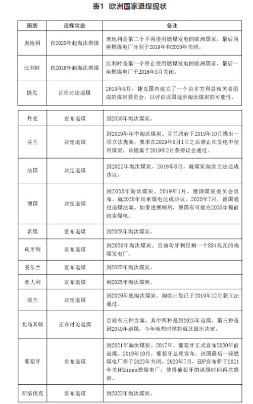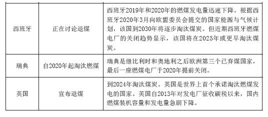 為了落實《巴黎協(xié)定》中的溫室氣體減排目標,歐洲各國政府陸續(xù)公布了淘汰煤炭的時間表(見表1)。第一個結(jié)束燃煤使用歷史的歐洲國家為比利時,該國于2016年停止使用煤炭。2020年,奧地利和瑞典相繼關(guān)停各自國內(nèi)最后一座燃煤電廠,正式結(jié)束燃煤發(fā)電歷史。