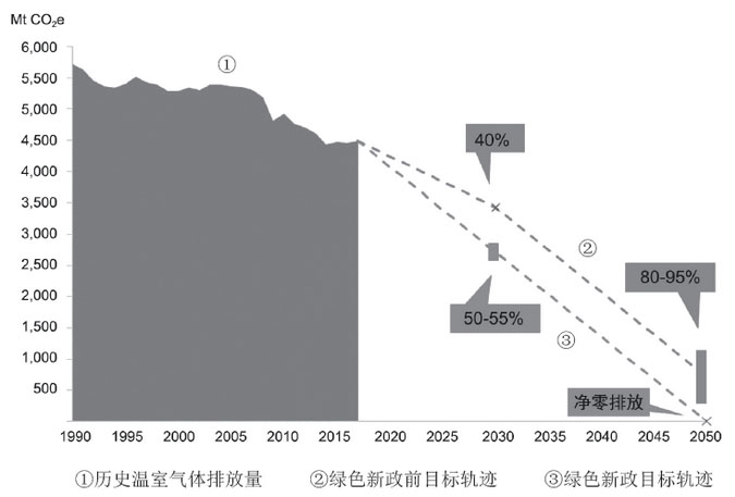 2019年12月,歐盟委員會正式發(fā)布《歐洲綠色協(xié)議》(簡稱“綠色新政”),闡明歐洲邁向氣候中性循環(huán)經(jīng)濟體的行動路線,提出提高歐盟2030和2050年氣候目標,即2030年溫室氣體排放量在1990年基礎(chǔ)上減少50%~55%,2050年實現(xiàn)凈零排放的碳中和目標(見圖1)。