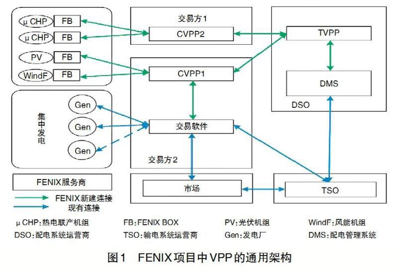 2005年~2009年,來自歐盟8個國家的20個研究機構(gòu)和組織合作實施和開展了FENIX項目,F(xiàn)ENIX的目標是通過將分布式能源資源聚合成大型VPP和分散管理,最大限度地提高分布式能源對電力系統(tǒng)的貢獻,擺脫傳統(tǒng)對電力系統(tǒng)小單元的管理。