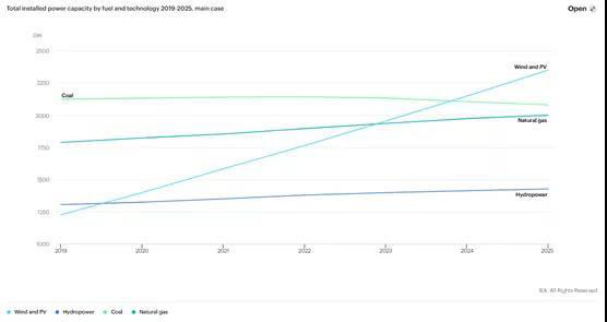 2023年風能和太陽能的裝機容量將超過天然氣,2024年超過煤炭。到2025年,僅太陽能光伏發(fā)電就占了可再生能源新增裝機容量的60%,風能占30%。在成本進一步下降的推動下,海上風力發(fā)電量將大幅增加,到2025年將占新增風力發(fā)電裝機的五分之一。海上風電的增長將從歐洲轉移到中國和美國等仍有巨大潛力的新市場。全球范圍內可再生能源的快速增長,要求政府加大對可再生能源的政策關注,以確保它們能夠安全、經(jīng)濟地融入電力系統(tǒng)。