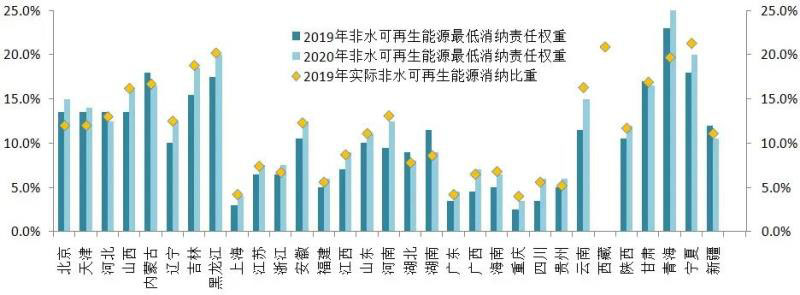 圖1 非水可再生能源2019年電量占比、2019和2020年消納保障機(jī)制目標(biāo)(數(shù)據(jù)來源:國家能源局)