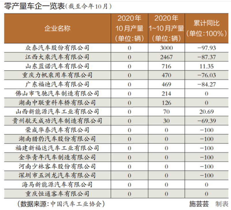 正如蔡榮華所言,我國(guó)汽車產(chǎn)銷量占全球30%左右,企業(yè)競(jìng)爭(zhēng)日趨激烈,但是盲目投資、產(chǎn)能利用率比較低的問(wèn)題尚未得到有效解決?!吨袊?guó)汽車工業(yè)產(chǎn)銷快訊》(2020年第11期)數(shù)據(jù)顯示,在總共被統(tǒng)計(jì)的88家汽車企業(yè)中,今年10月汽車產(chǎn)量為零的汽車企業(yè)竟然多達(dá)17家(事實(shí)上,這一數(shù)據(jù)在8月為16家),今年前10個(gè)月產(chǎn)量低于500輛的共有25家,其中,有8家生產(chǎn)企業(yè)今年未生產(chǎn)過(guò)1輛汽車,占比接近一成。