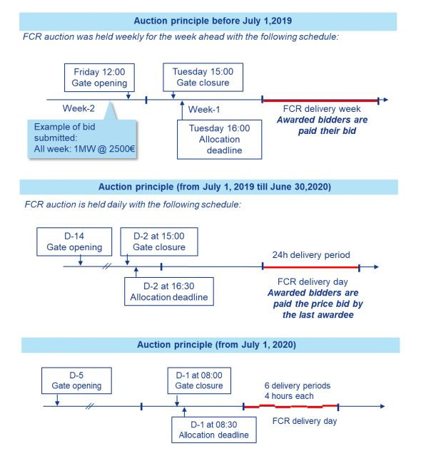 另一變化發(fā)生在2020年7月1日,因?yàn)轭l率控制(FCR)拍賣的時間表再次改變:市場參與者不再競拍24小時的產(chǎn)品,現(xiàn)在每天可以6次競拍4小時的交貨期。這種演變?yōu)槭袌鰠⑴c者提供了更大的靈活性,使他們能夠在同一天內(nèi)參與其他市場并使收入來源多樣化。因此,由于頻率控制(FCR)價(jià)格可能會反映市場狀況(白天價(jià)格較高,夜間價(jià)格較低),因此提高市場透明度。