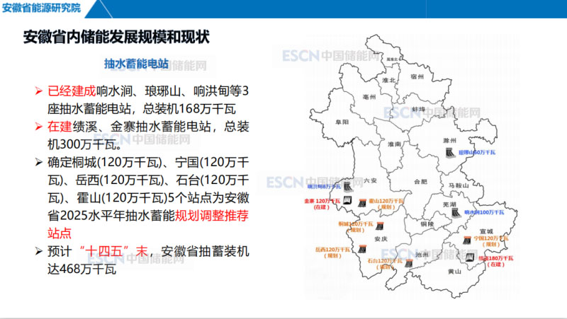 抽水蓄能電站是安徽省目前的主要儲(chǔ)能資源,已建成3座抽蓄能電站,總裝機(jī)168萬(wàn)千瓦。在建的還有兩個(gè)抽蓄能電站,總裝機(jī)300萬(wàn)千瓦。