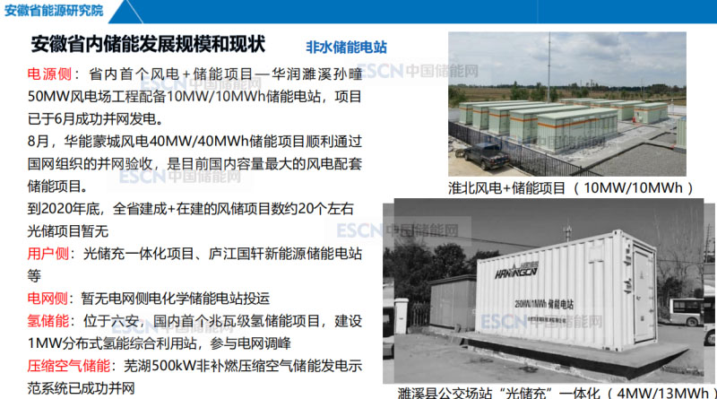 非水儲(chǔ)能電站方面,電源側(cè)、用戶(hù)側(cè)、電網(wǎng)側(cè)、氫儲(chǔ)能、壓縮空氣儲(chǔ)能。省內(nèi)首個(gè)風(fēng)電+儲(chǔ)能項(xiàng)目孫疃50MW風(fēng)電場(chǎng)工程配置10MW-10MWh儲(chǔ)能電站,項(xiàng)目已于6月成功并網(wǎng)發(fā)電。用戶(hù)側(cè)包括光儲(chǔ)充一體化項(xiàng)目,廬江新能源儲(chǔ)能電站等;電網(wǎng)側(cè)暫時(shí)沒(méi)有電化學(xué)儲(chǔ)能電站投運(yùn);氫儲(chǔ)能是國(guó)內(nèi)首個(gè)兆瓦級(jí)氫儲(chǔ)能項(xiàng)目,建設(shè)1MW分布式氫能綜合利用站,參與電網(wǎng)調(diào)峰;蕪湖500KW非補(bǔ)燃?jí)嚎s空氣儲(chǔ)能發(fā)電示范系統(tǒng)已成功并網(wǎng)。安徽省抽水蓄能電站資源豐富,參與本省和華東調(diào)頻輔助服務(wù)市場(chǎng),調(diào)頻缺口比較小,儲(chǔ)能聯(lián)合火電調(diào)頻市場(chǎng)空間相對(duì)有限。用戶(hù)側(cè)儲(chǔ)能有海量、分散等特點(diǎn),受制于安徽省目前缺乏相應(yīng)的政策支持和電價(jià)空間,發(fā)展前景不明朗,未來(lái)需借助儲(chǔ)能技術(shù)進(jìn)步和成本下降,在相關(guān)政策引導(dǎo)下不斷探索用戶(hù)側(cè)商業(yè)運(yùn)營(yíng)模式。未來(lái)安徽省儲(chǔ)能市場(chǎng)空間主要集中于新能源配套儲(chǔ)能和電網(wǎng)側(cè)儲(chǔ)能,用于解決新能源消納、電網(wǎng)調(diào)峰能力不足,地區(qū)負(fù)荷快速增長(zhǎng)帶來(lái)的電網(wǎng)設(shè)施送電能力與需求不匹配,部分關(guān)鍵節(jié)點(diǎn)和通道組阻塞的問(wèn)題,從目前看,安徽地區(qū)風(fēng)電配置儲(chǔ)能主要是平抑新能源對(duì)電網(wǎng)供需平衡的影響,加速項(xiàng)目并網(wǎng),屬企業(yè)自愿調(diào)峰責(zé)任,電網(wǎng)側(cè)儲(chǔ)能還需詳細(xì)落地政策支持。