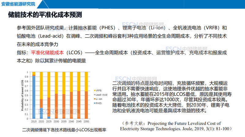 如何填補(bǔ)巨大的調(diào)峰缺口。在儲(chǔ)能方面,確立怎樣的技術(shù)路線(xiàn)。我們參考國(guó)外的研究團(tuán)隊(duì),計(jì)算了抽蓄、鋰離子電池、全釩液流電池和鉛碳電池,在調(diào)峰、二次調(diào)頻和峰谷套利3種應(yīng)用場(chǎng)景的全生命周期平準(zhǔn)化成本,分析了不同技術(shù)在未來(lái)的成本競(jìng)爭(zhēng)力。以二次調(diào)頻為例,特點(diǎn)是放電時(shí)間短、充放循環(huán)頻繁,大規(guī)模運(yùn)行并且不需要快速響應(yīng),這使地理?xiàng)l件優(yōu)越的抽蓄非常適用。根據(jù)計(jì)算結(jié)果,抽蓄在2015年的LCOS最低,原因是使用壽命超過(guò)30年,年循環(huán)多達(dá)1000次,盡管其投資成本比較高。但隨著電池技術(shù)的投資成本不斷降低,到2030年可以預(yù)計(jì)看到鋰離子電池和全釩液流電池在成本上的優(yōu)勢(shì)。