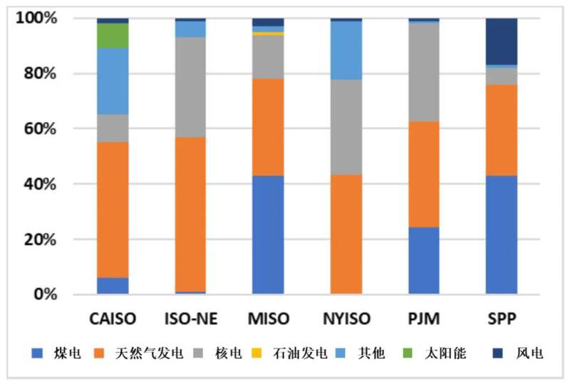 圖1 2019年1―11月美國主要電力市場(chǎng)發(fā)電結(jié)構(gòu)