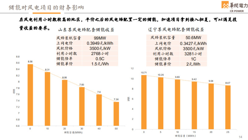 我剛才說(shuō)了風(fēng)電配儲(chǔ)能目前來(lái)說(shuō),算在風(fēng)電投資方的成本里面,幾乎沒(méi)有任何收益來(lái)源,所以我們也看了一下,目前我們的兩個(gè)風(fēng)電項(xiàng)目,如果按照當(dāng)?shù)氐囊笈鋬?chǔ)能對(duì)收益率是什么樣的影響?在山東的風(fēng)電廠,99MW的容量,如果不配儲(chǔ)能收益率是8.5,如果要配的話(huà),山東是20%,就降到7.3,對(duì)收益率的影響是比較大的。遼寧的小時(shí)數(shù)就比較高的,他的承受能力非常強(qiáng)了,如果配到10%收益率影響是非常有限的,所以新能源的配儲(chǔ)能的商業(yè)模式還是跟風(fēng)電廠整體計(jì)算的模式。