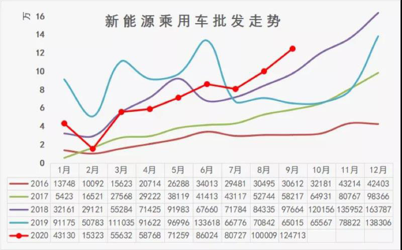 根據(jù)乘聯(lián)會(huì)的數(shù)據(jù),2020年Q3,新能源乘用車的批發(fā)量達(dá)到了305,449輛,同比增幅達(dá)50.7%,9月份的增幅達(dá)91.8%。