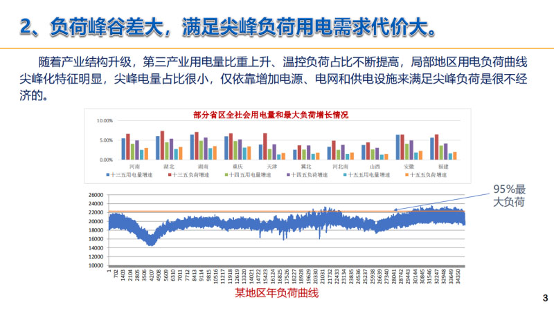 2、從電力系統(tǒng)建設(shè)和運營經(jīng)濟性的角度,未來負荷中心的峰谷差呈現(xiàn)逐漸增大的趨勢,通過下面的柱狀圖看到無論是十三五還是十四五、十五五的預測當中,負荷的增速都是大于用電量的增速,負荷特性尖峰化的特征越來越明顯,尖峰電量占比很少,對于這部分尖峰負荷的供電,僅僅依靠增加電源、電網(wǎng)和供電設(shè)施來滿足對電網(wǎng)的建設(shè)還是很不經(jīng)濟的。下面是某負荷中心的年負荷曲線,如果按95%最大負荷劃線的話超過95%的負荷是很少的。