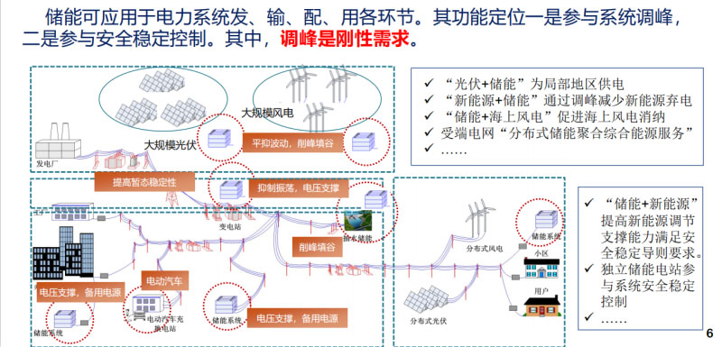 二、來看一下儲能在電網(wǎng)當中的應用,首先在穩(wěn)態(tài)功率平衡當中的應用,儲能就像保溫瓶,這樣的東西在電網(wǎng)的哪個環(huán)節(jié)不需要?所以可以說在發(fā)、輸、配、用各個環(huán)節(jié)都需要的,調(diào)峰是剛性需要的。光伏+儲能、風電+儲能、新能源+儲能都是常見的場景。