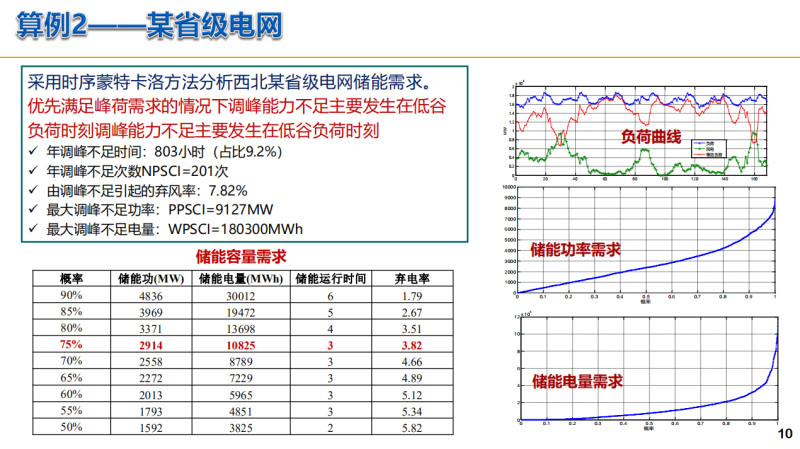 剛才這種方法是基于確定性的方法,把一年的風電和光伏的曲線進行持續(xù)的模擬,畢竟風電和光伏是隨機性的,所以說可以引入考慮隨機性的模擬方法,對多年的風資源的特性和光資源特性進行模擬,這樣得到儲能的配比更具有可行性。這里也是以西北某省級電網(wǎng)做了一個算例,可以得到一年當中調(diào)峰不足的時間,次數(shù),產(chǎn)生的棄風率是多少,電量是多少。
