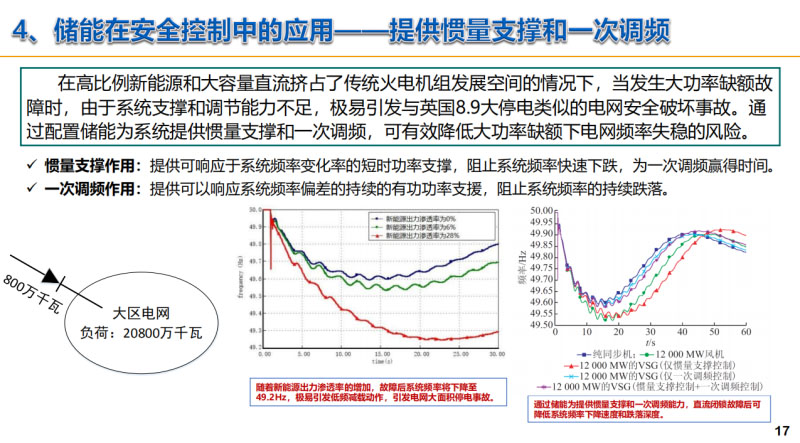 4、提供慣量支撐和一次調(diào)頻,在高比例的新能源和大容量直流擠占了傳統(tǒng)火電機組發(fā)展空間的情況下,當發(fā)生大功率缺額故障的時候,存在引發(fā)系統(tǒng)穩(wěn)定破壞的風險,如果配置儲能為系統(tǒng)提供一次調(diào)頻和慣量支撐可以有效降低這種風險。儲能在提供慣量支撐主要是提供響應于系統(tǒng)頻率變化的短時功率支撐,阻止系統(tǒng)頻率快速下跌,為一次調(diào)頻贏得時間,在一次調(diào)頻方面是響應系統(tǒng)頻率偏差,阻止系統(tǒng)頻率的持續(xù)跌落。以一個大區(qū)電網(wǎng)為例,如果特高壓直流、雙級故障損失800萬千瓦,大區(qū)電網(wǎng)中新能源出力滲透率增加到28%時,故障后系統(tǒng)頻率將下降到49.2赫茲,容易引發(fā)低頻減載的動作,引發(fā)電網(wǎng)大面積停電。如果利用儲能提供慣量和一次調(diào)頻,能夠相當于把新能源替換成常規(guī)同步機的效果,可以減少頻率的跌落。