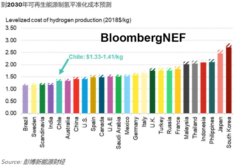 智利有意充分利用國(guó)內(nèi)優(yōu)越的可再生資源,以較低的成本生產(chǎn)綠氫,并以足夠低的成本在歐洲和東亞的綠氫出口市場(chǎng)上競(jìng)爭(zhēng)。雖然智利的目標(biāo)看似很高,但到2030年將綠氫制備成本降至1.5美元/千克以下的目標(biāo)似乎是可以實(shí)現(xiàn)的。
