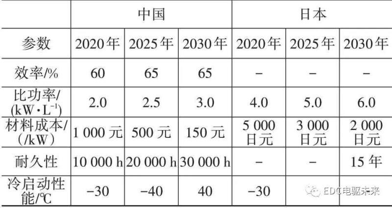 表1 各國(guó)燃料電池相關(guān)規(guī)劃中電堆性能指標(biāo)