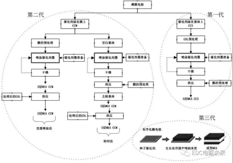 膜電極按催化劑初始噴涂載體可分為GDE 和CCM 2 種模式。GDE 模式是將催化劑噴涂于氣體擴(kuò)散層上,然后熱壓夾住中間的質(zhì)子交換膜。CCM 模式是將催化劑直接噴涂在質(zhì)子交換膜上,然后再覆上氣體擴(kuò)散層。其中因CCM 模式材料利用率高而成為行業(yè)趨勢(shì)。CCM 模式又可進(jìn)一步分為轉(zhuǎn)印法、超聲波噴涂法和卷到卷狹縫擠壓法。目前而言,第一代雙面轉(zhuǎn)印CCM 工藝和第二代陰極直涂陽(yáng)極轉(zhuǎn)印工藝仍繼續(xù)被采用。豐田采用卷到卷狹縫擠壓法進(jìn)行膜電極的生產(chǎn)。雙面噴涂法在解決了質(zhì)子交換膜在膜電極制備中的溶脹、收縮、起皺問(wèn)題后,其更高的生產(chǎn)效率優(yōu)勢(shì)將得以充分顯現(xiàn)。膜電極制備中的催化劑料、溶劑類(lèi)型和比例、漿料整體粘度、噴涂模具、涂布角度諸多因素影響著膜電極的產(chǎn)品質(zhì)量和性能。
