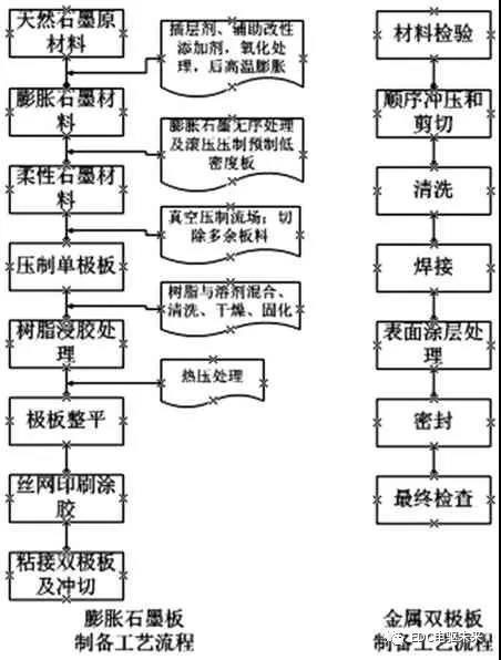 石墨雙極板的制造主要可分為數(shù)控機(jī)械加工和模壓2 種類(lèi)型,另外少量采用注塑成型。其中模壓是將混合粉料加入預(yù)熱好的模具,固化后得到雙極板,因其適合大批量生產(chǎn),易于降低制造成本,目前應(yīng)用廣泛。近年來(lái),以Ballard 柔性膨脹石墨板為代表的產(chǎn)品因其較為卓越的性能,也得到了廣泛的關(guān)注。金屬雙極板采用沖壓、液壓、輥壓成型等方式生產(chǎn),生產(chǎn)效率高,但需要解決流道加工和耐腐蝕鍍層等問(wèn)題。典型石墨板和金屬板的加工工藝流程如圖3。