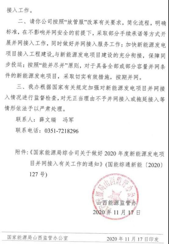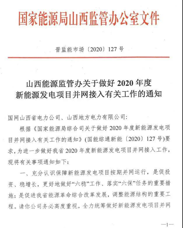 山西能源監(jiān)管辦日前印發(fā)《關(guān)于做好2020年度新能源發(fā)電項(xiàng)目并網(wǎng)接入有關(guān)工作的通知》,要求按照“能并盡并”原則,對(duì)于具備全部或部分容量并網(wǎng)條件的新能源發(fā)電項(xiàng)目,采取切實(shí)有效措施,全力統(tǒng)籌做好新能源發(fā)電項(xiàng)目并網(wǎng)接入工作,確保按期并網(wǎng)。