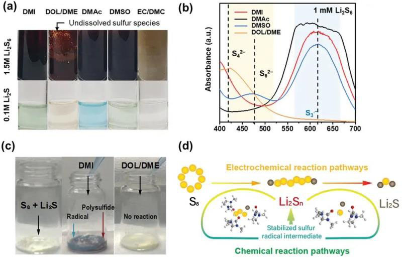 1) 首次提出以1,3-二甲基-2-咪唑啉酮(DMI)為鋰硫電池溶劑。DMI對(duì)多硫化鋰溶解度高,且二者不發(fā)生反應(yīng);