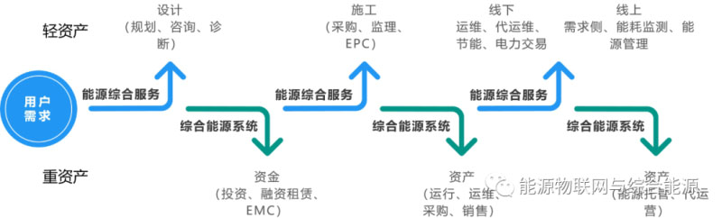 對于輕資產的能源綜合服務模式,又分為線下和線上兩種方式。如果采用純線下技術服務的方式,在規(guī)劃設計等項目前期階段,存在項目復雜、周期長、規(guī)模較小等弱點,且本身業(yè)務市場規(guī)模小,將導致業(yè)務規(guī)模擴張受限;在項目后期提供運維、代運維或售電等服務,一方面市場拓展存在地域性、商務投入與收入平衡等方面的局限,另一方面存在單項業(yè)務收益和利潤低,業(yè)務規(guī)模和價值線性發(fā)展等問題。如果采用純線上平臺產品服務的方式,一方面存在產品本身標準化難、價值呈現(xiàn)不清晰、用戶認可度參差不齊等問題,另一方面存在產品與能源系統(tǒng)物聯(lián)技術和工程實施的難度和周期等問題。因此,輕資產模式在用戶獲取、價值確認、價值變現(xiàn)、用戶粘性等方面具有自身的弱點。
