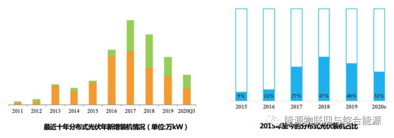 而同在新能源領域,截止2020年9月,光伏累計裝機規(guī)模223GW,其中,分布式71.2GW,占比32%,集中電站151.8GW,占比68%。近10年光伏裝機中集中式和分布式的占比如圖5所示,圖中左側綠色為分布式光伏裝機。2013年和2017年,光伏裝機均有一次階段性的大幅增長;而2017年以來,分布式光伏在光伏裝機容量中的比例明顯加大,約占32%~47%。