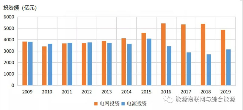 圖2. 2009-2019年全國電源投資和電網(wǎng)投資對比圖[1]