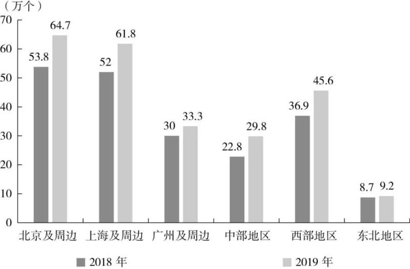 2019年5月,工信部發(fā)布《全國數(shù)據(jù)中心應(yīng)用發(fā)展指引(2018)》,測算到2019年,北京及周邊(河北、天津、內(nèi)蒙古)、上海及周邊(浙江、江蘇)、廣州及周邊(廣東、福建)、中部地區(qū)(安徽、湖北、湖南、河南、江西、山西)、西部地區(qū)(廣西、寧夏、新疆、青海、陜西、甘肅、四川、西藏、貴州、云南、重慶)、東北地區(qū)(黑龍江、吉林、遼寧)的可用機(jī)架數(shù)量分別為64.7萬個、61.8萬個、33.3萬個、29.8萬個、45.6萬個、9.2萬個,對應(yīng)占比26.5%、25.3%、13.6%、12.2%、18.7%、3.8%;其中北京、上海及周邊和西部是2019年的主要增長點(見圖4.6)。