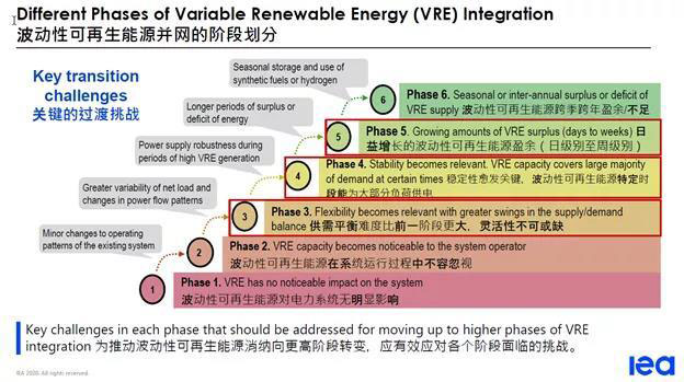國際能源署IEA在相關報告中詳細分析了波動性可再生能源并網(wǎng)的不同階段劃分,以及給電力系統(tǒng)帶來的挑戰(zhàn)。IEA報告指出,隨著可再生能源比例的提高,電力供給的波動性增大,那么供需平衡難度會逐漸增加,需要不斷提高電力系統(tǒng)的靈活性,來應對挑戰(zhàn),實現(xiàn)源網(wǎng)荷儲一體化協(xié)調發(fā)展。