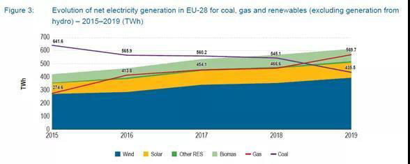 圖8 2015年以來歐盟28國煤炭,天然氣和非水可再生能源發(fā)電量(TWh)