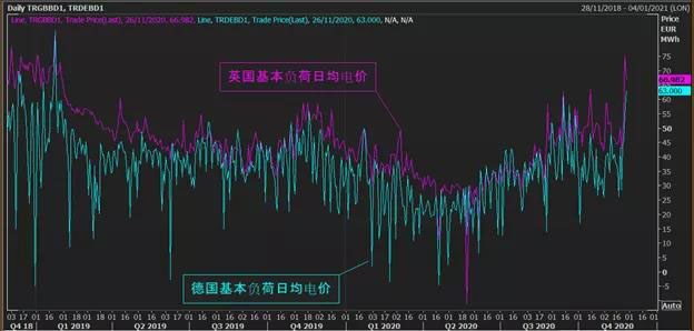 圖7 2018年以來英國和德國基本負荷日均電價走勢(歐元每兆瓦時)