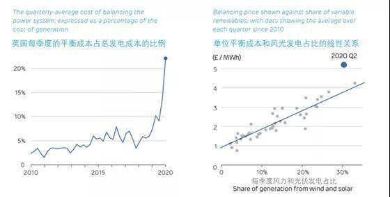 除了對退煤和綠色轉型的潛在影響,可再生能源波動性對電力系統(tǒng)的沖擊尤其是平衡成本的影響也備受關注。今年5月份,英國電網(wǎng)為了平衡電力系統(tǒng)供需,要協(xié)商暫時關停風電場和激勵需求側管理,避免風光出力高峰階段影響電網(wǎng)穩(wěn)定。英國發(fā)電商Drax集團的最新研究報告指出,盡管近年來電力現(xiàn)貨市場平均電價走低以及負電價頻發(fā),但是波動性可再生能源給電力系統(tǒng)帶來的平衡成本不斷增加,平均約為5英鎊每兆瓦時,高于前些年的1英鎊的水平,這有可能增加消費者的成本。該分析指出,英國電力系統(tǒng)的平衡成本隨著波動性可再生能源比例的提高已經(jīng)比之前增加了20%。在2010年,每季度平衡成本平均約占總發(fā)電成本的5%, 然而這一比例在近年來逐漸升高,如圖5左圖所示,在2020年高達20%以上,每個月的平衡成本平均一億英鎊。分析還計算了風力和光伏發(fā)電占比和平衡成本的關系,前者每增加一個百分點,系統(tǒng)平衡成本就增加約0.1英鎊每兆瓦時。這一平衡成本被電網(wǎng)傳導轉移給發(fā)電商和消費者,會造成終端電價逐漸上升。