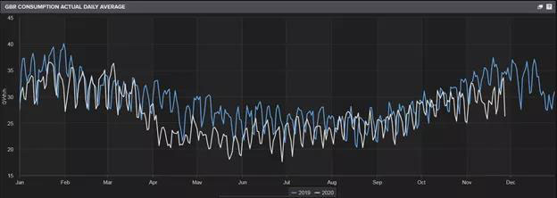 圖3 2019年和2020年英國日均電力負荷(GW)