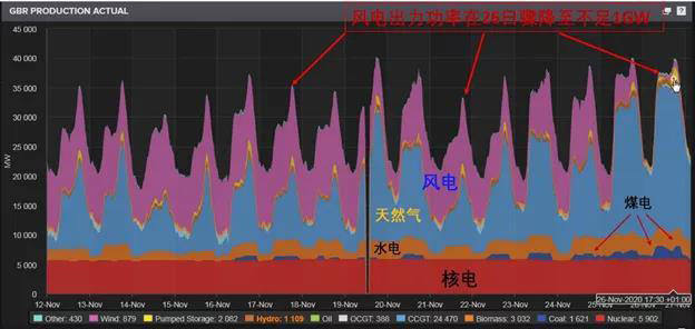 而這次的電力短缺警告,已經(jīng)是英國國家電網(wǎng)在兩個月之內第三次發(fā)布類似的通知。10月中旬和11月初,同樣都是因為風力發(fā)電極低以及部分電廠維護而造成電力供需失衡,電網(wǎng)負荷裕度面臨挑戰(zhàn),電網(wǎng)不得不兩次發(fā)出緊急通告,考慮啟動備用電源和需求側響應等靈活性措施,避免出現(xiàn)供需缺口。而英國電網(wǎng)之前發(fā)布的年度供需預測,認為今年由于疫情壓低電力負荷,電力供給的可用容量應該比往年要略微寬裕,甚至需要補貼核電站在一些時段削減發(fā)電量來避免過高的風電沖擊電網(wǎng)系統(tǒng)。總體來看,由于疫情影響,尤其是10月份以來歐洲國家普遍實施了第二輪封禁措施,電力負荷一直都低于往年。如圖3所示,2020年的日均負荷在3月份疫情爆發(fā)之后大幅下降,低于去年水平。最低只17GW,比2019年的最低水平低5 GW。而即便是由于低溫推高了11月26日的電力負荷,也仍然低于去年同一時期的水平??梢?,英國近期內電力短缺警告頻繁的主要原因,還是因為風力發(fā)電驟降,反映了可再生能源的波動性和間歇性。