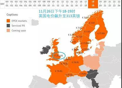11月25日,英國國家電網(wǎng)(National Grid)發(fā)出警告,預計26日的電力系統(tǒng)會面臨供給短缺的風險,主要由于氣溫驟降推高電力負荷,疊加風電出力極低,使得系統(tǒng)的負荷裕度極低,需要更多的備用電源及靈活性措施。面對供需緊張的形勢,電力現(xiàn)貨市場出現(xiàn)了巨幅波動,26日傍晚18時英國電價飆升至350歐元(313英鎊)每兆瓦時。這是同一時段挪威電價的70倍。整個西歐的電價也都因為低風電下電力供給緊張,而走高至80歐元每兆瓦時的罕見高價位。